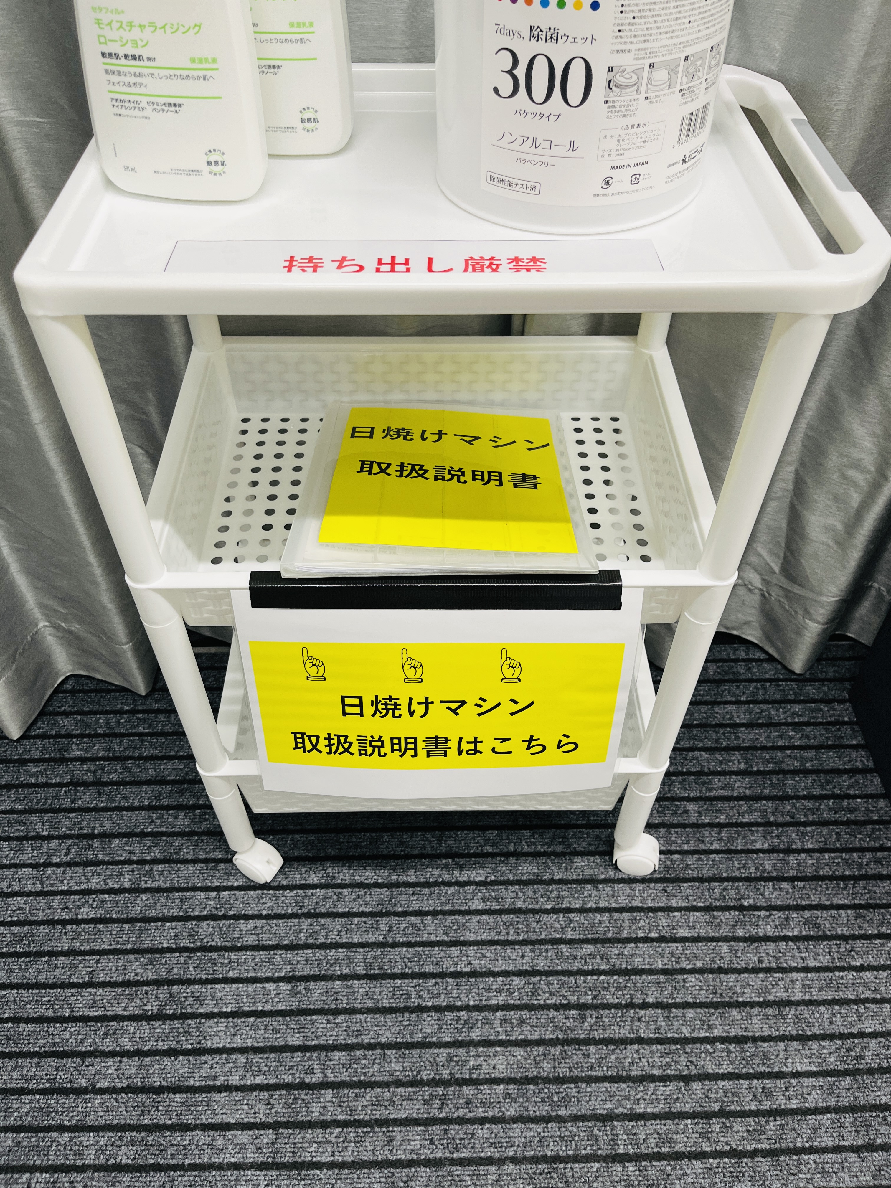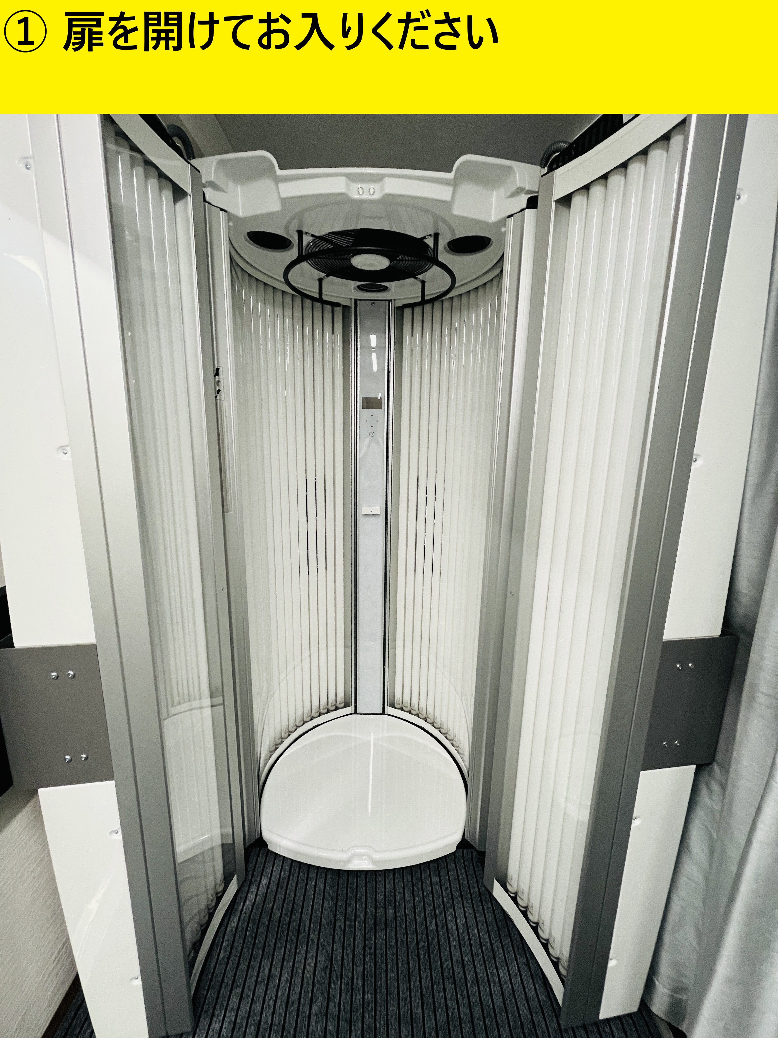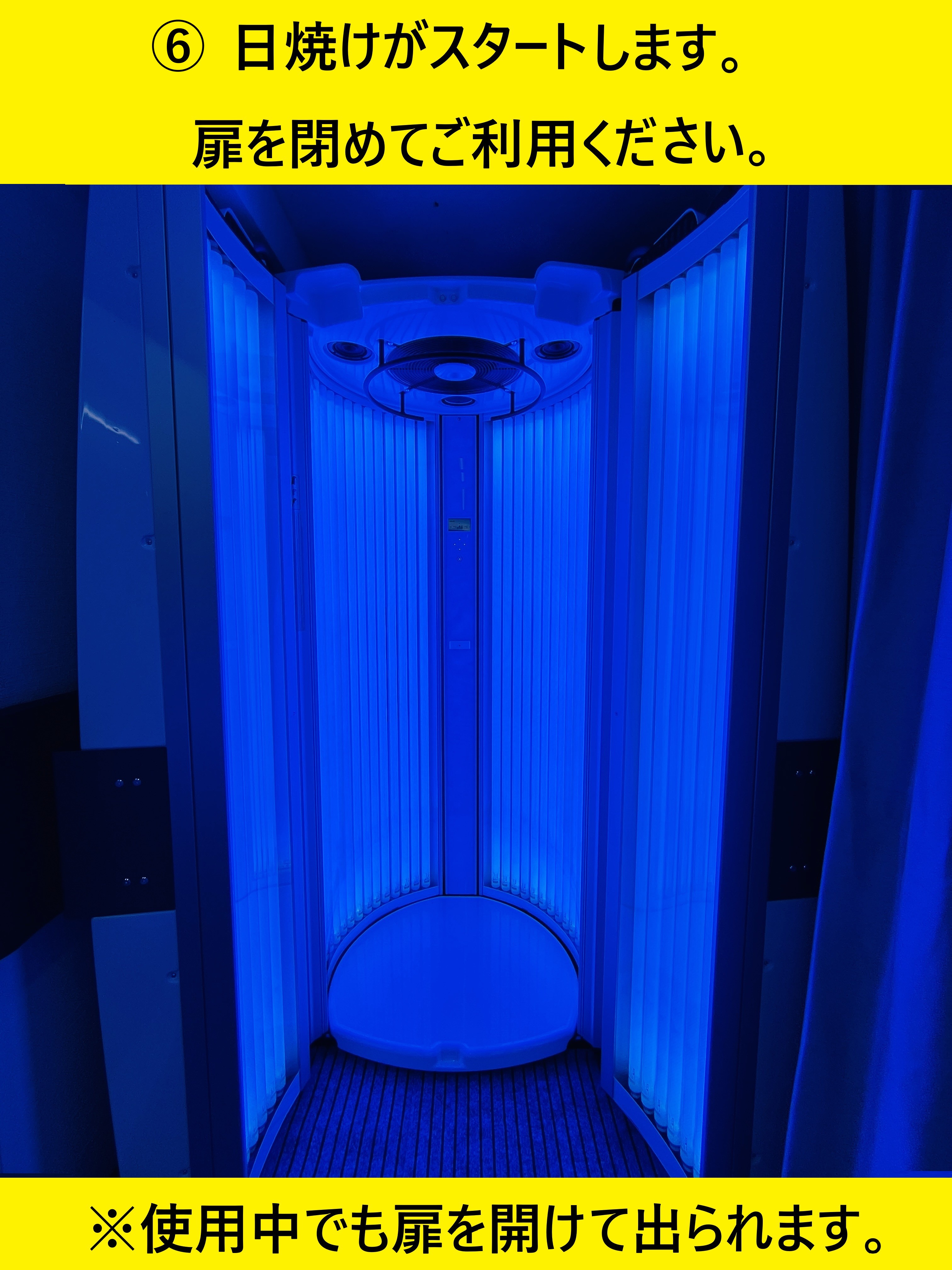 日焼け中は目を閉じてご利用ください。途中、薄目で残り時間を確認される程度は問題ありません。どうしても目を閉じれない方や気になる方は、備え付けのゴーグルもしくはご自身のサングラスやタオル等をご利用ください。また、お肌についているお化粧や塗り薬などは落としてからご利用ください。肌のシミの原因となります。お顔を焼きたくない場合はタオルなどをかけてご利用ください。