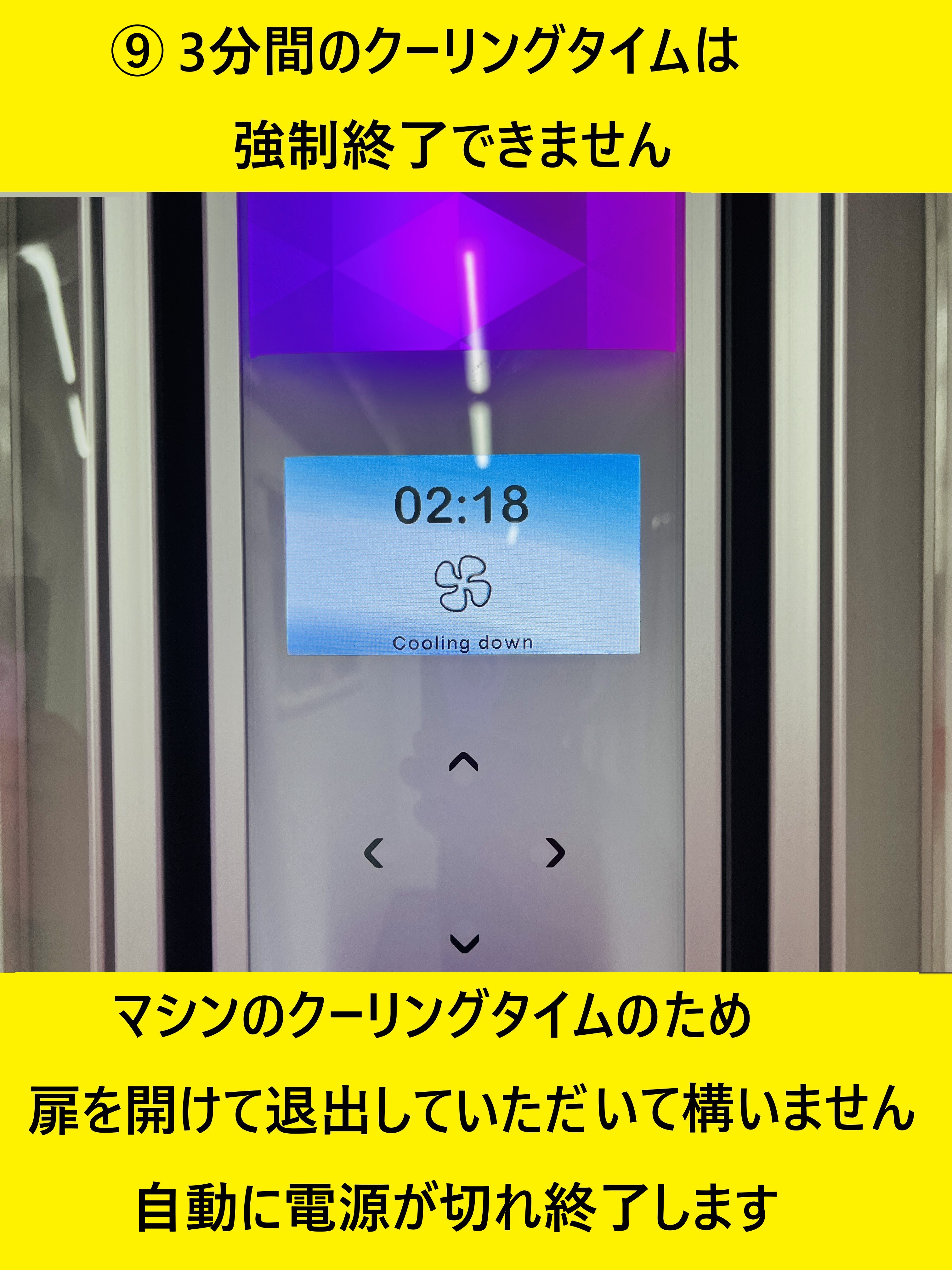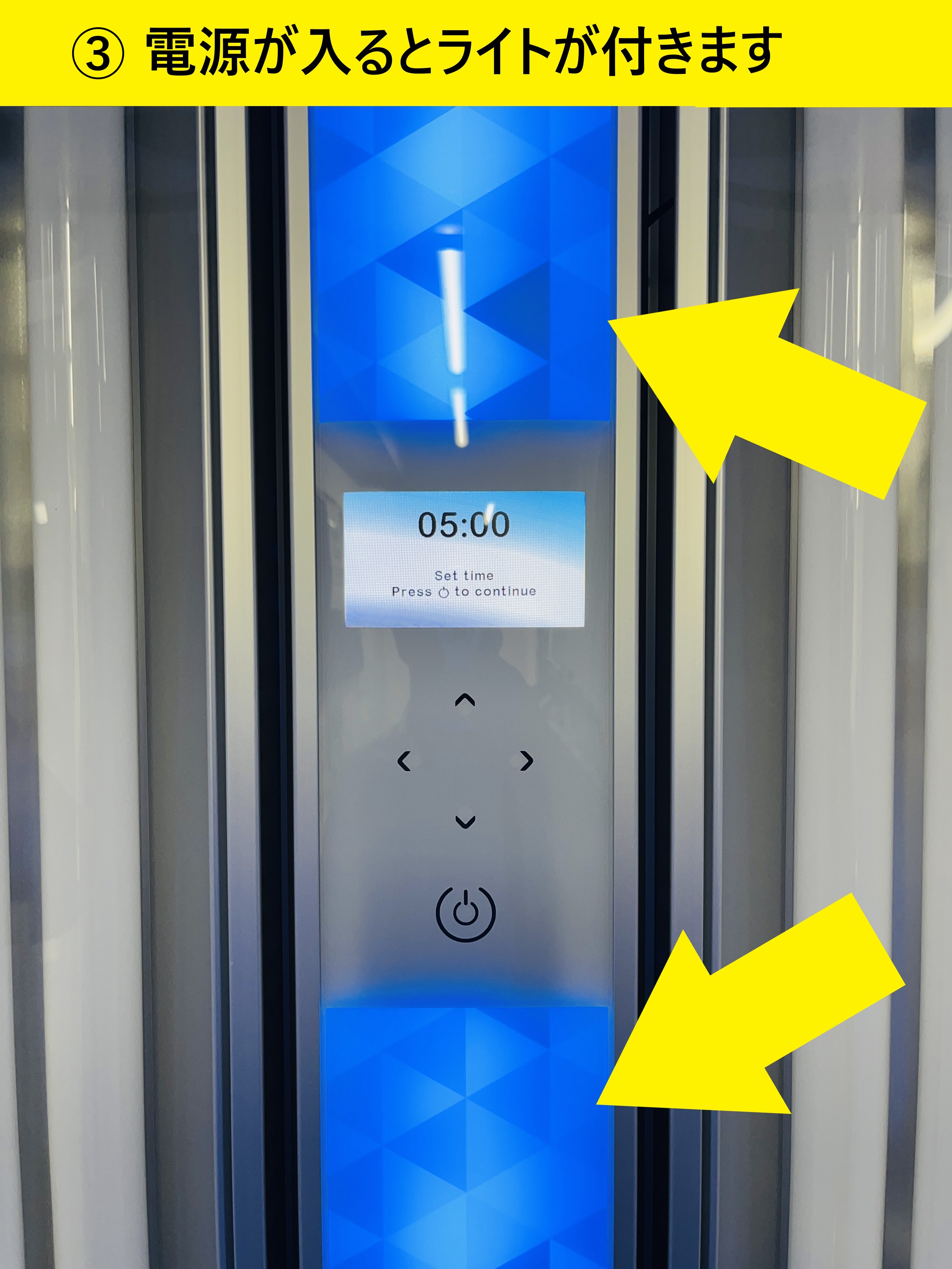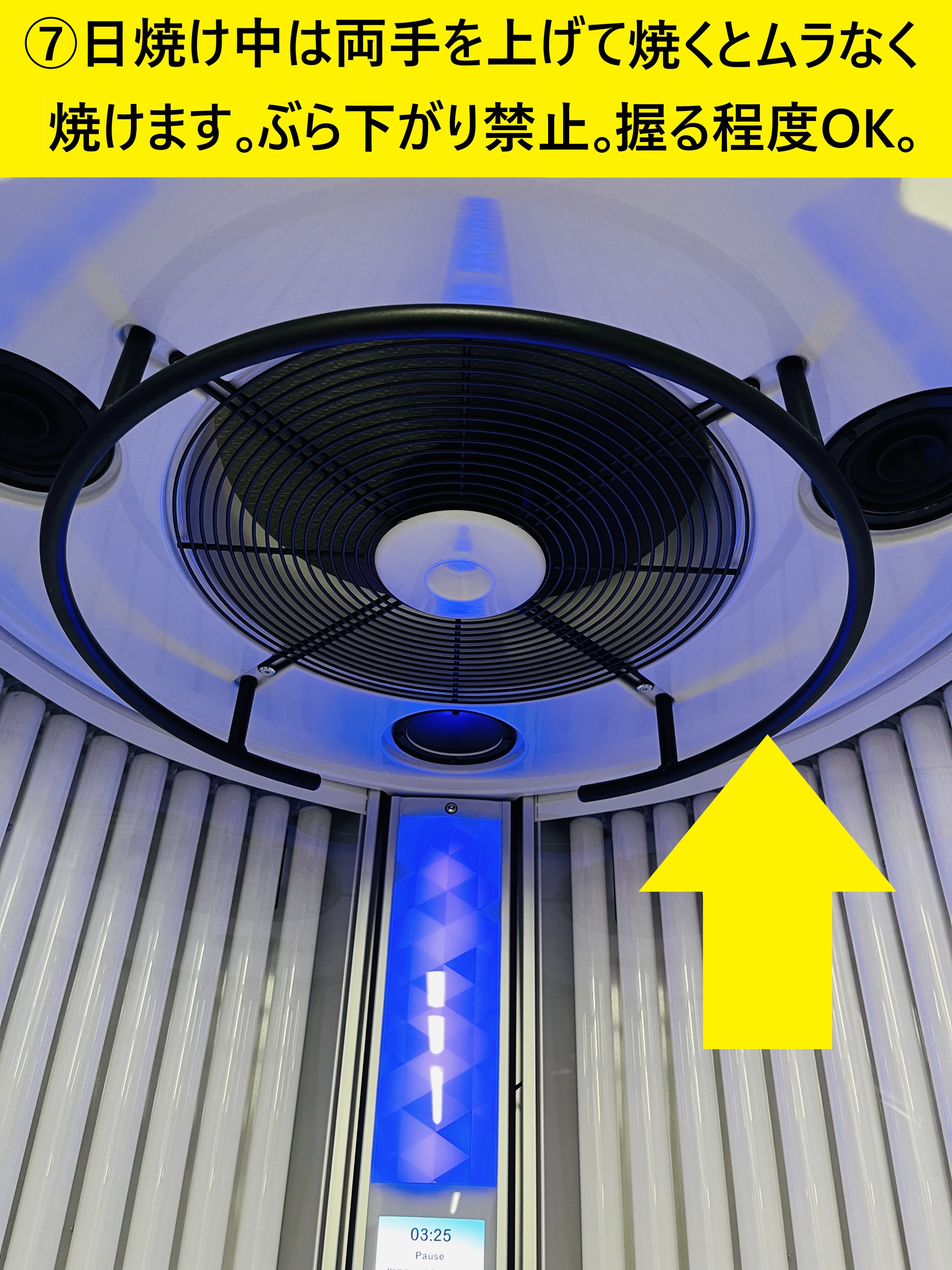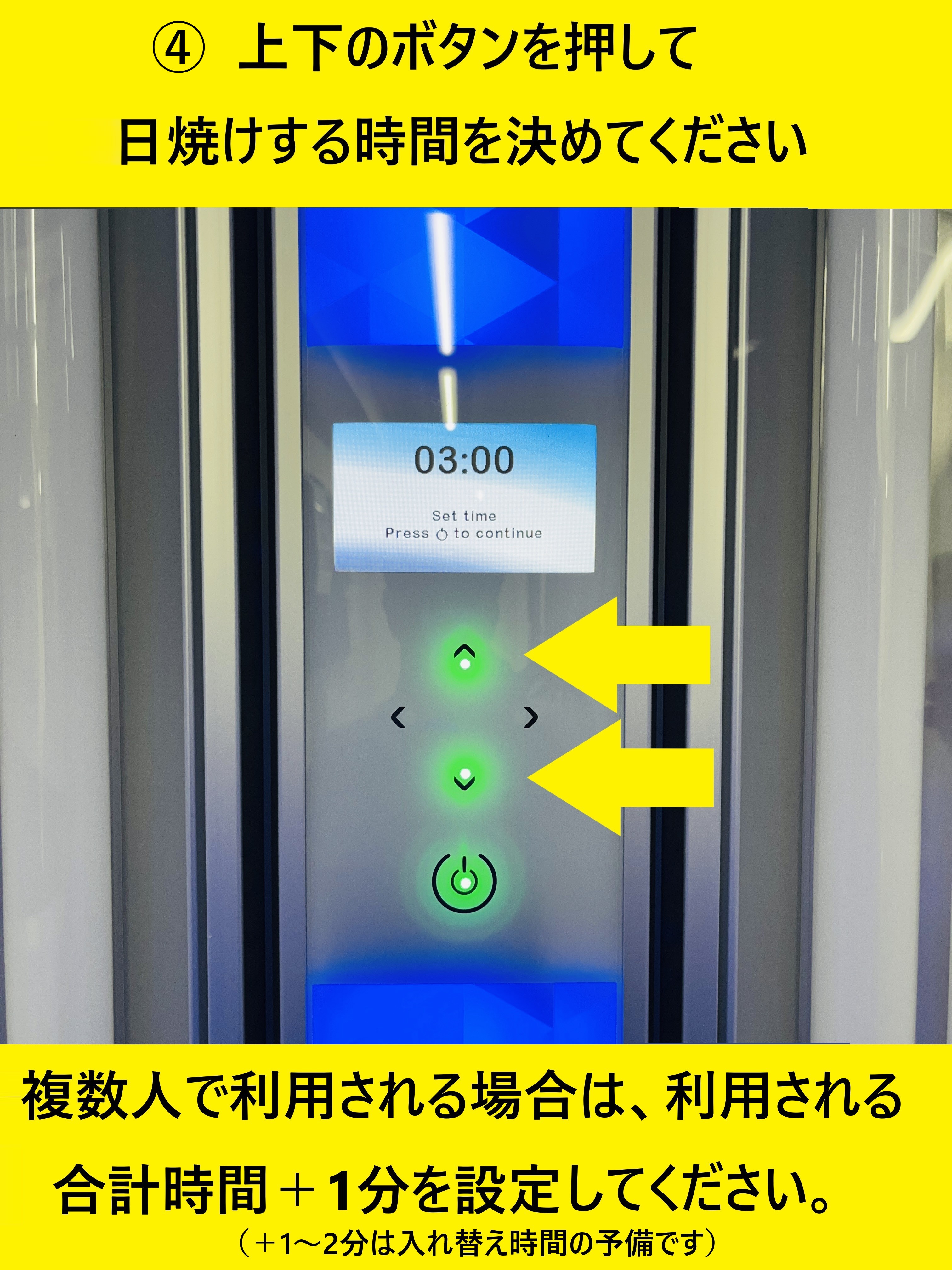 日焼け中は目を閉じてご利用ください。途中、薄目で残り時間を確認される程度は問題ありません。どうしても目を閉じれない方や気になる方は、備え付けのゴーグルもしくはご自身のサングラスやタオル等をご利用ください。また、お肌についているお化粧や塗り薬などは落としてからご利用ください。肌のシミの原因となります。お顔を焼きたくない場合はタオルなどをかけてご利用ください。