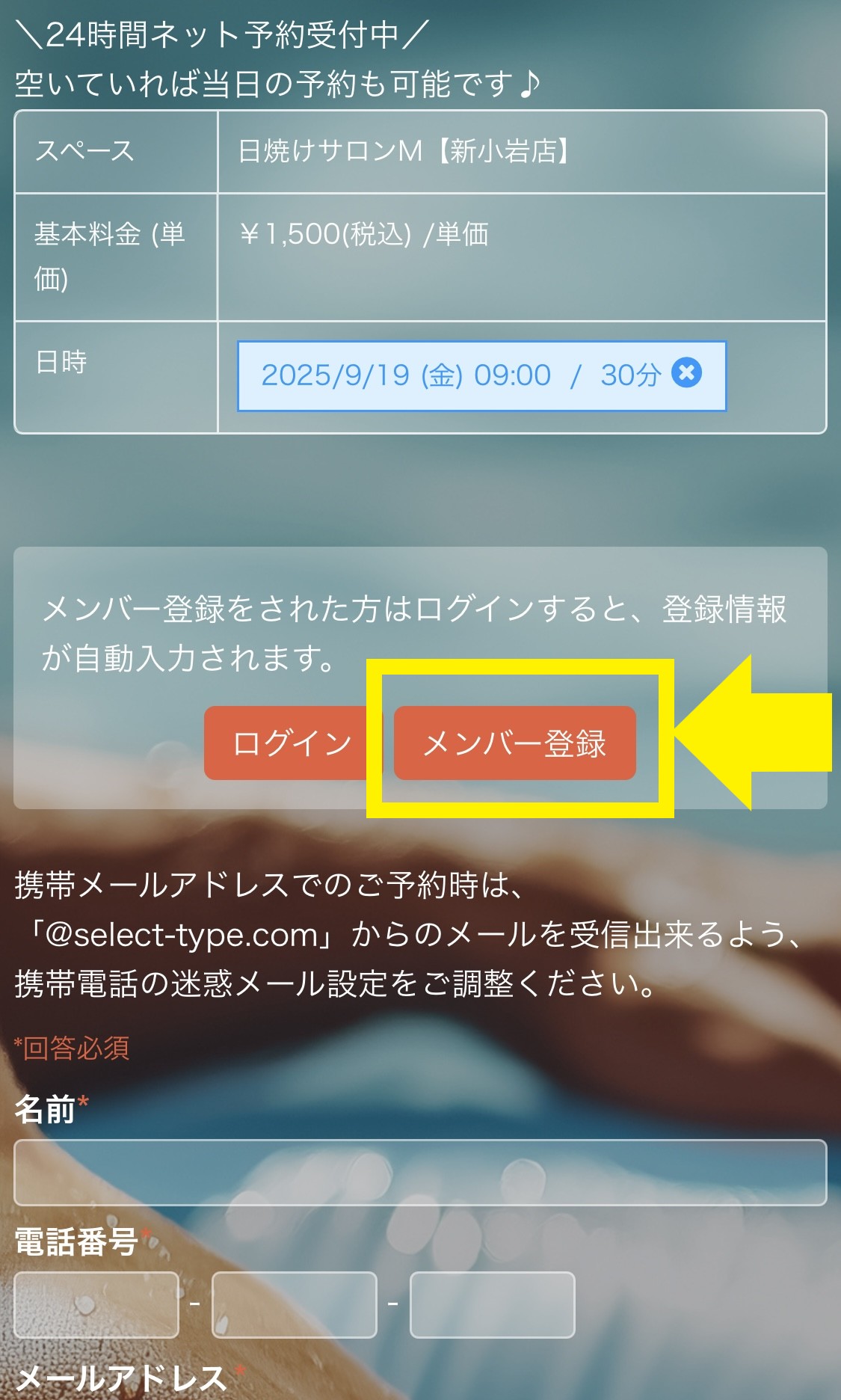 次に、ご新規の方は「メンバー登録(無料)」を選択してください。メンバー登録をしなくても次に進めますが、次回ご利用の際に入力の手間が省けてスムーズにご利用いただくことができます。