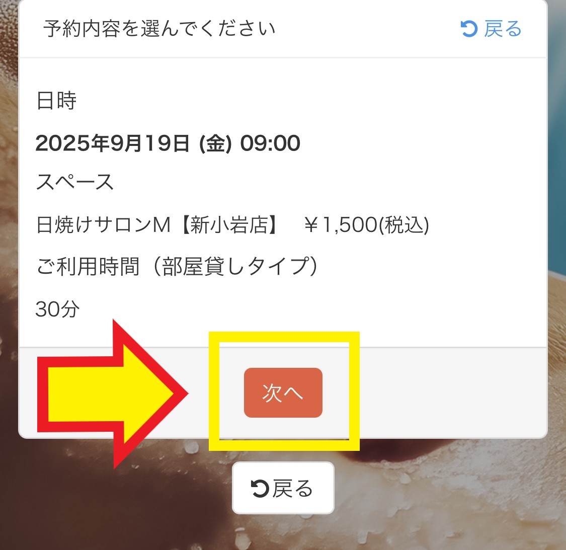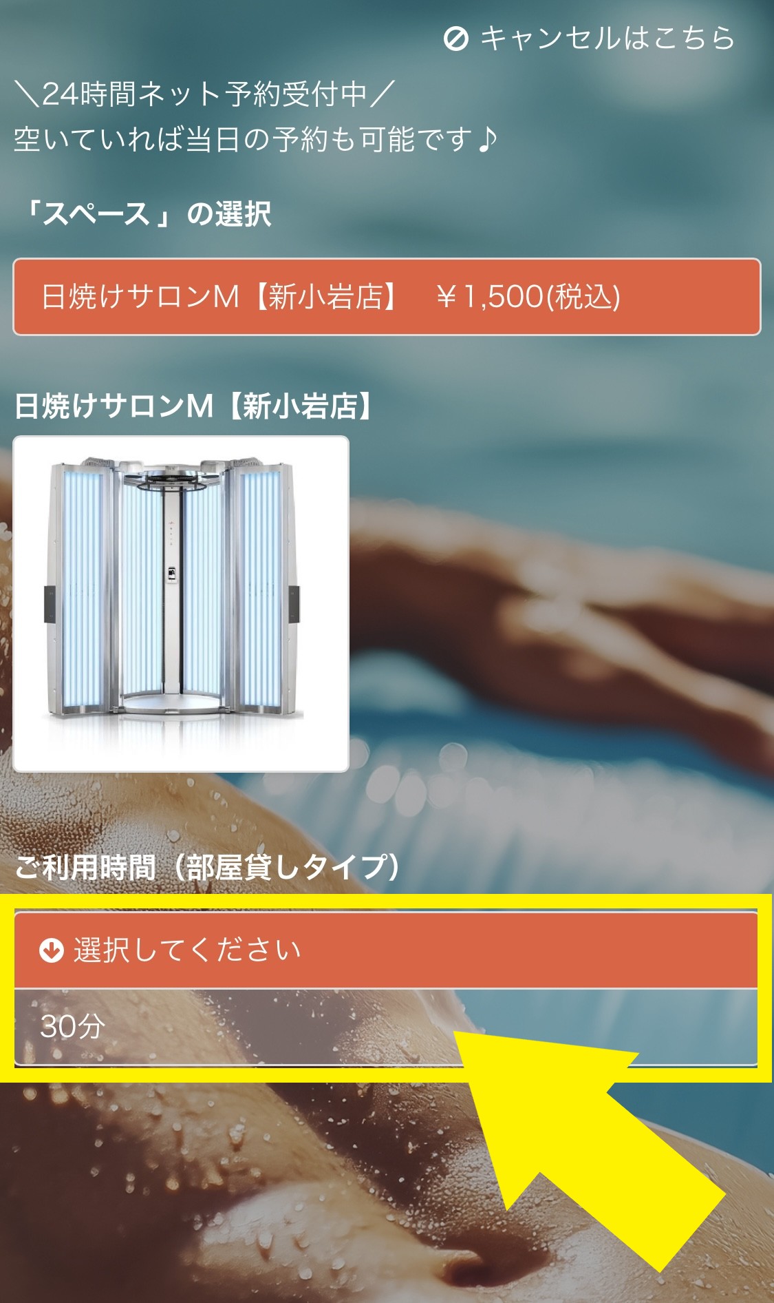 次に、「ご利用時間(30分)」を選択してください。当店は、【部屋貸しタイプ】となっているため、入店→着替え→日焼け→着替え→退出までの時間が利用時間に含まれております。ご利用時間内に必ず退出していただきますようお願いいたします。