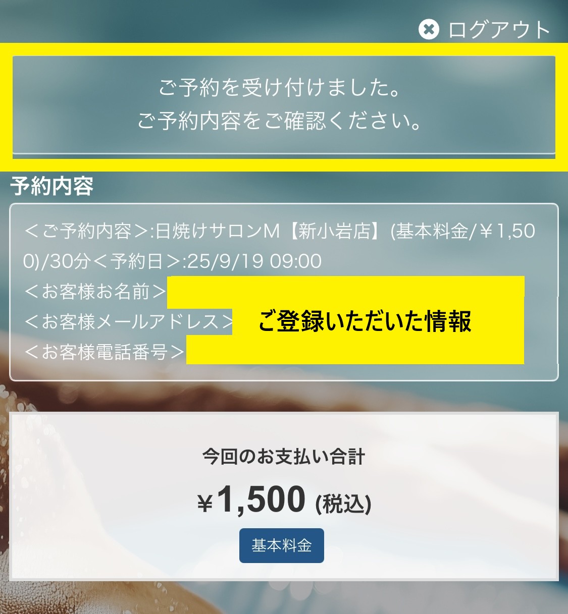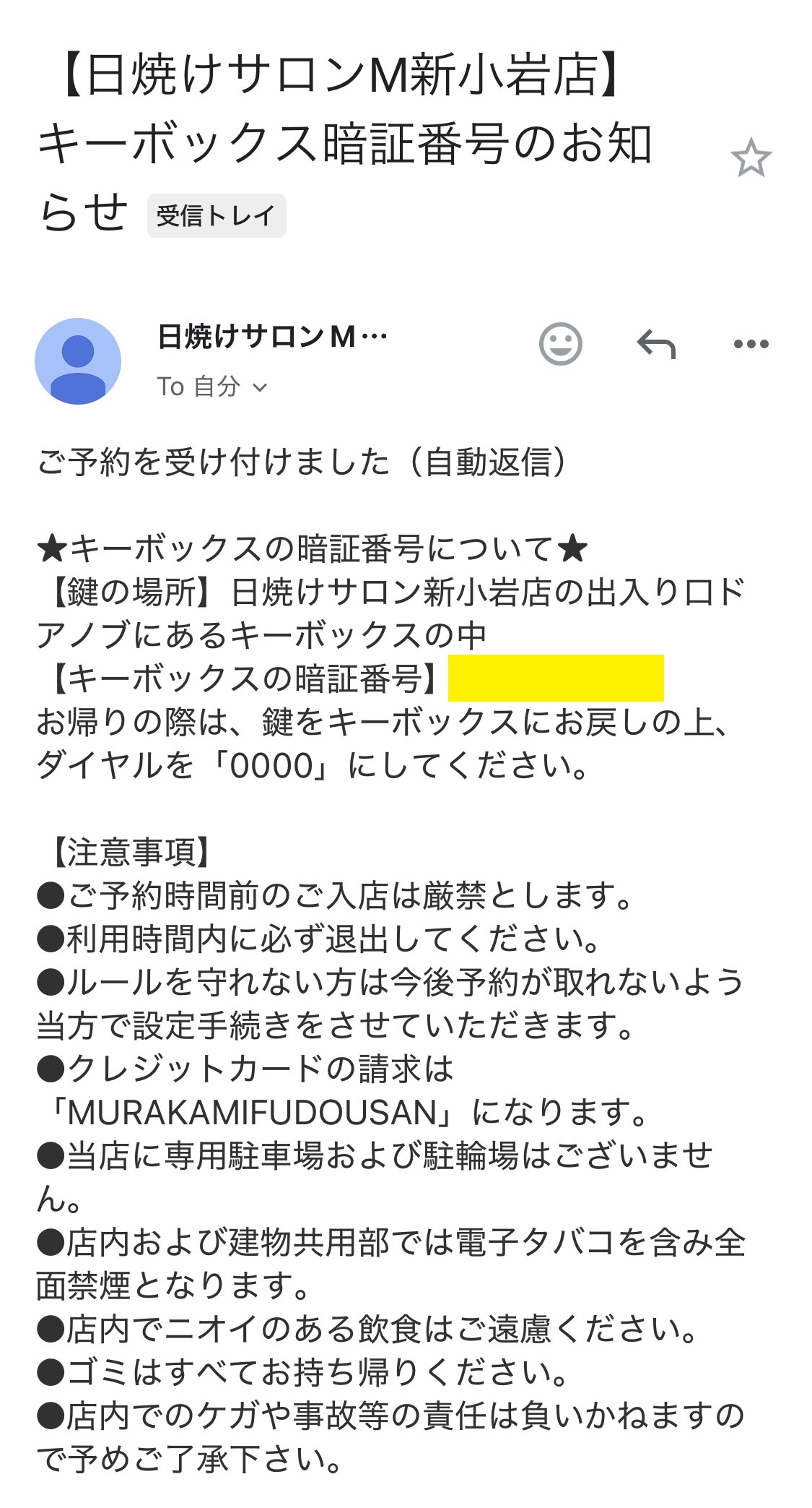 ご登録いただいたメールアドレス宛に予約完了メールが自動返信ですぐに届きます。こちらに、ご入店の際に必要となるキーボックスの暗証番号が明記されています。万が一、メールが届かない場合は、迷惑メールなどに誤って届いてないかご確認ください。どこにもメールが届いてない場合に限り、当店(TEL:03-5879-5448)にご連絡ください。その際に「日焼けサロンMの予約完了メールが届かないと」とお伝えいただければご案内がスムーズです。