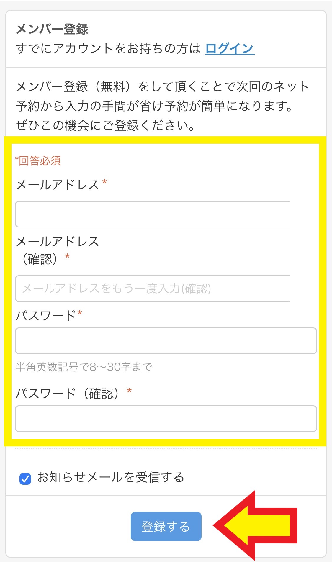 次に、「メンバー登録(無料)」される方は、メールアドレスとパスワード(半角英数記号8~30字まで)をご入力の上、「登録する」を選択してください。メールアドレスを間違えて登録されると予約した際の確認メールやご入店される際のキーボックスの暗証番号などが届かなくなってしまうので、お間違いのないようご登録ください。