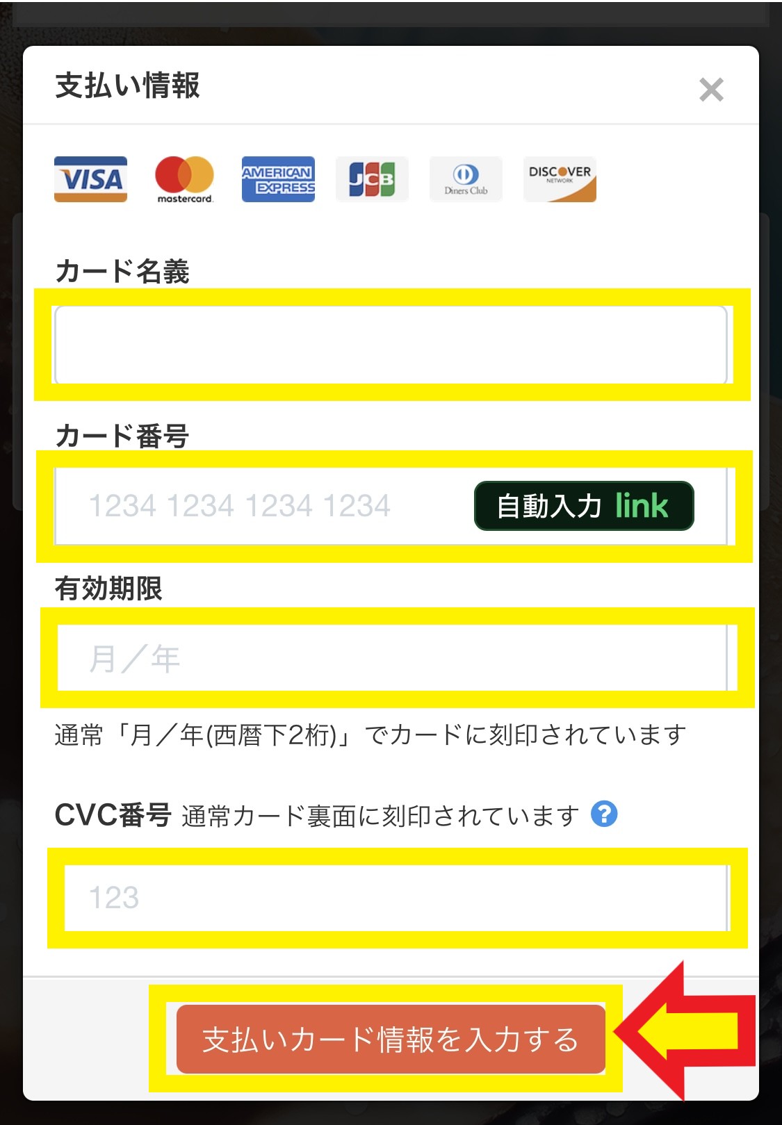 次に、クレジットカード情報をご入力の上、「支払いカード情報を入力する」を選択してください。ここでご登録できないカードは取り扱いできませんので、取り扱いできるカードでご登録をお願いいたします。