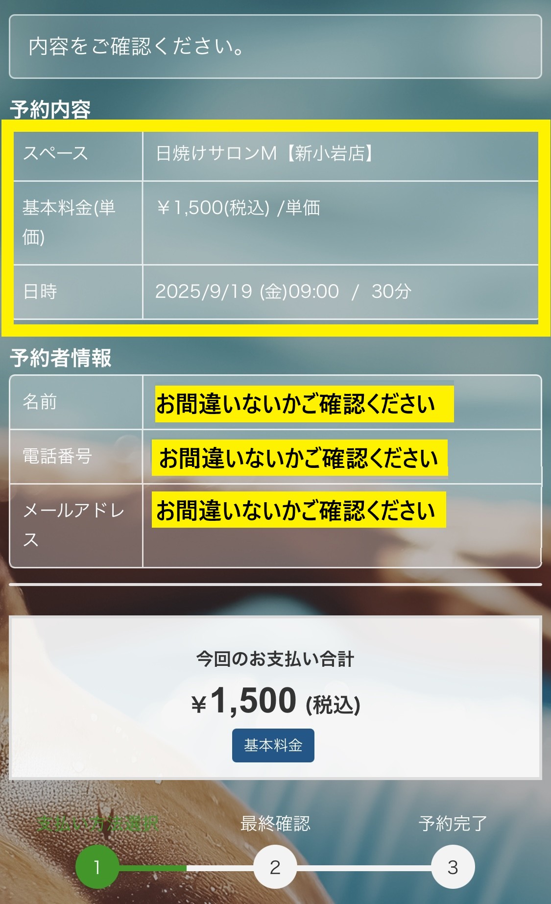 次に、「ご予約内容」と「予約者情報」をご確認ください。メールアドレスが間違っていないか再度ご確認ください。
