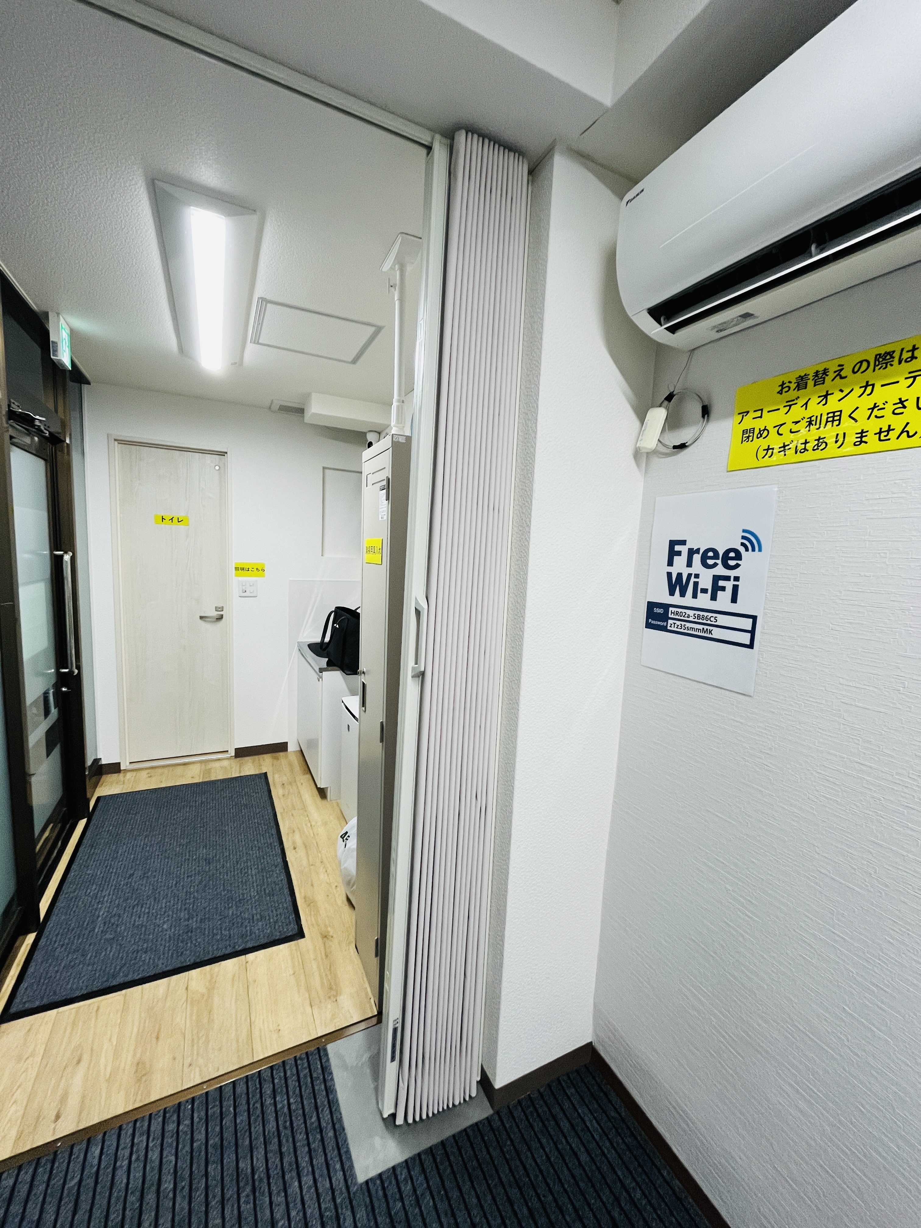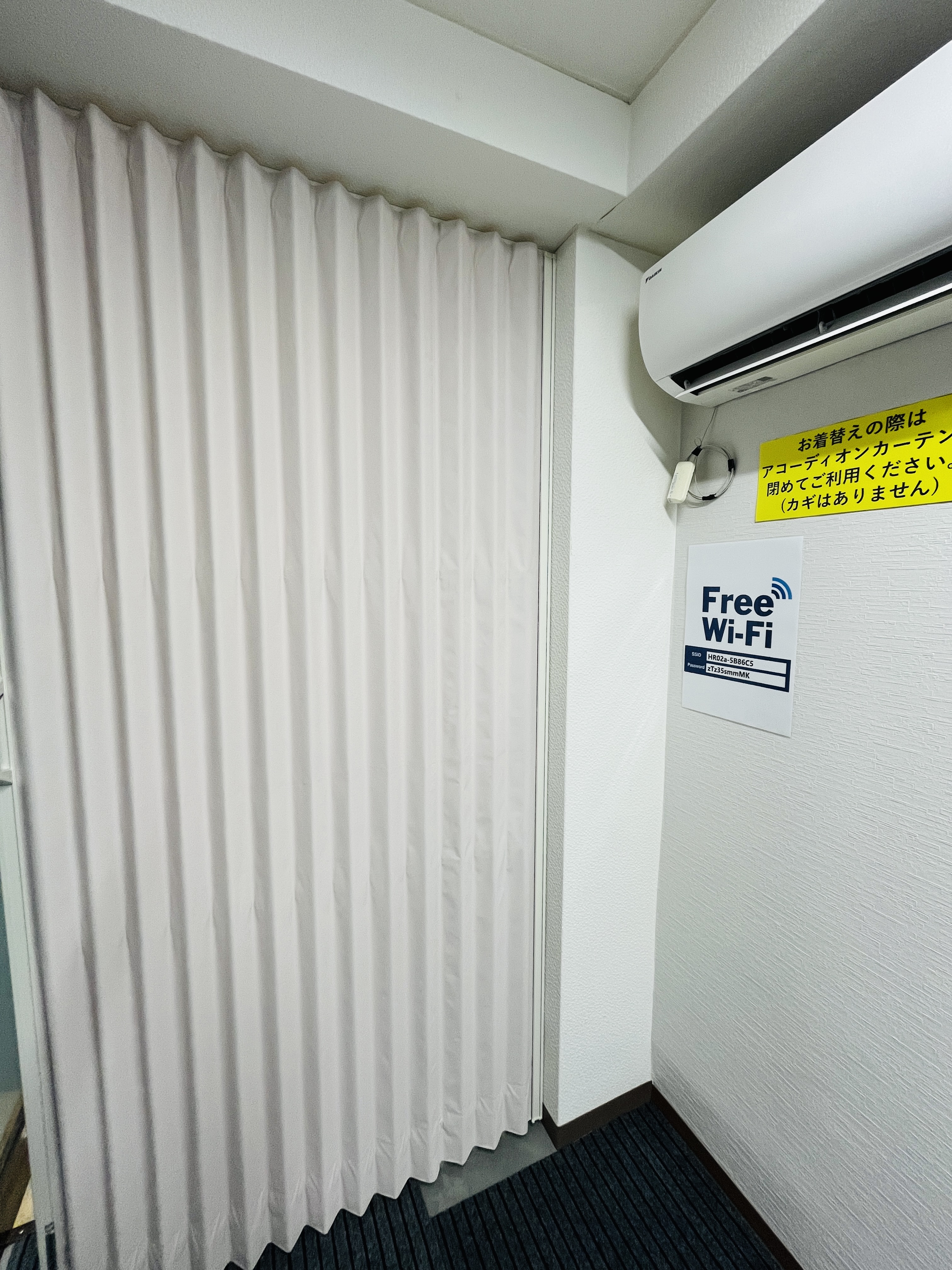 お着替えされる際はアコーディオンカーテンを閉めてご利用ください。無人店舗の為、不法侵入や予約時間外利用者を監視するために店内に防犯カメラを設置しておりますが、アコーディオンカーテンを閉めて頂くことにより、プライバシーは完全に確保されますのでご安心してご利用ください。