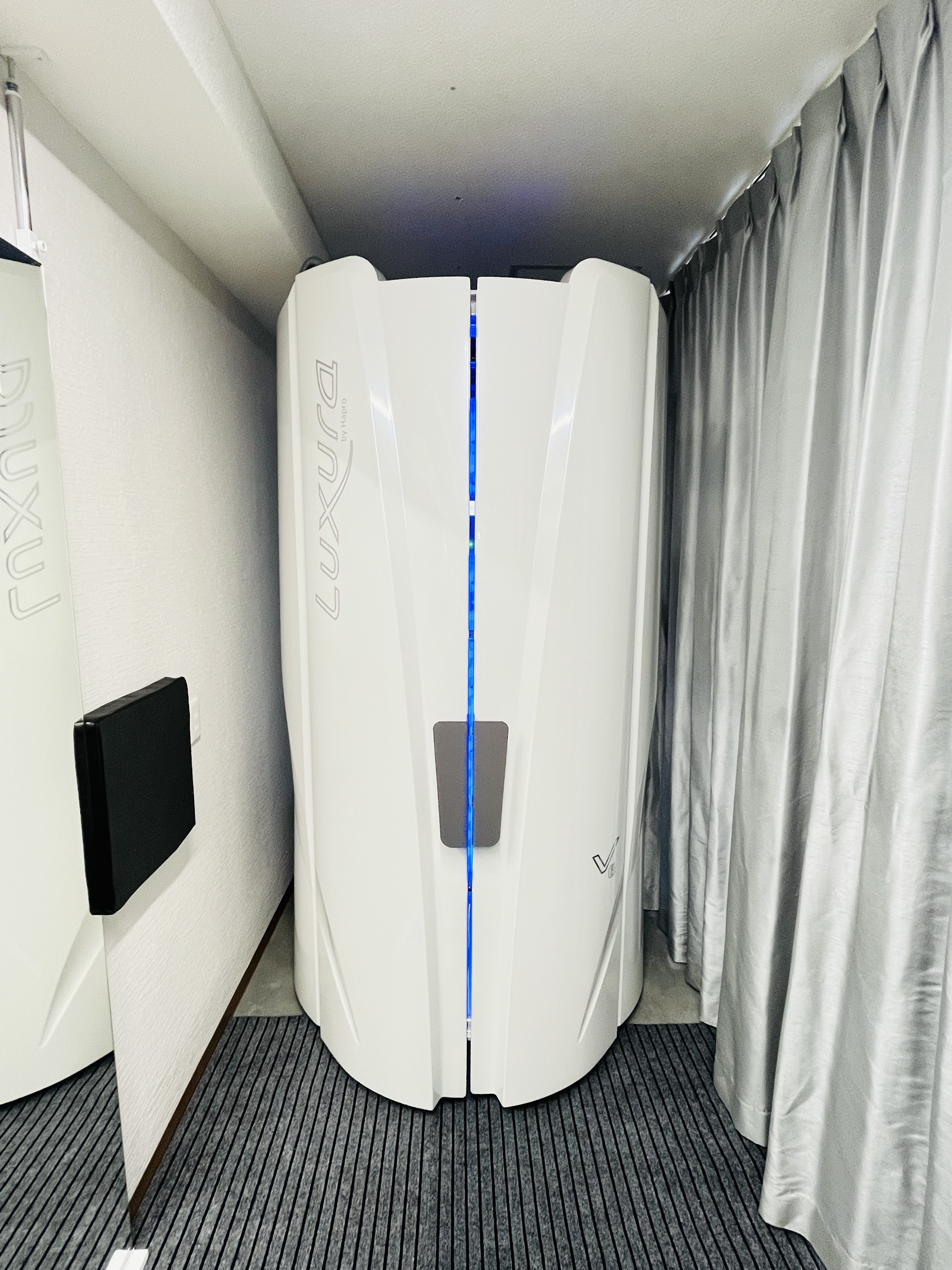 縦型マシンで360度にランプが付いているので、ムラなく均等に焼けます。なお、当店の日焼けマシンは出力が強力なため、サンオイルなどのご利用は禁止しております。何も塗らなくても綺麗に焼けます。(メーカー推奨)