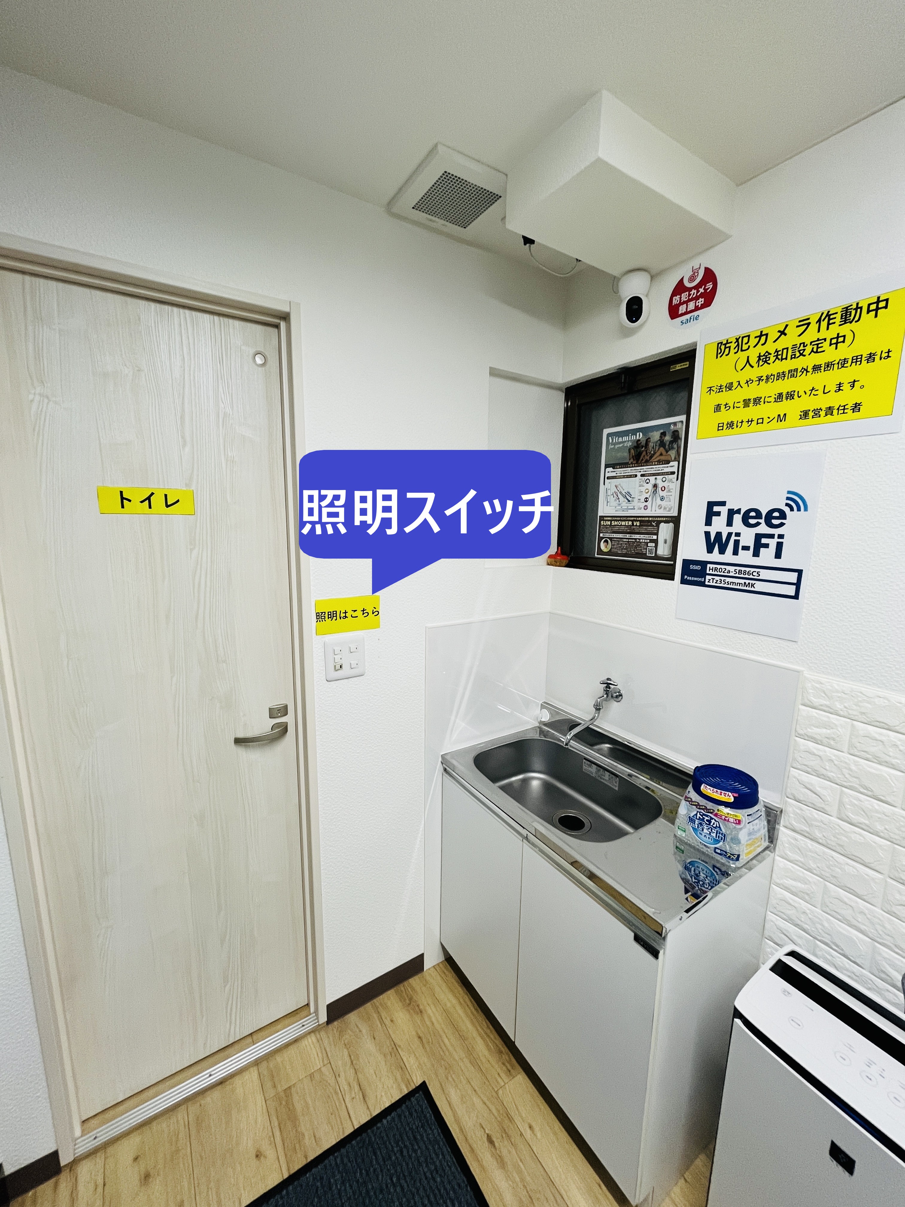 店内に入られましたら必ず鍵を閉めてご利用ください。お店に入って左手の壁に照明のスイッチがあります。