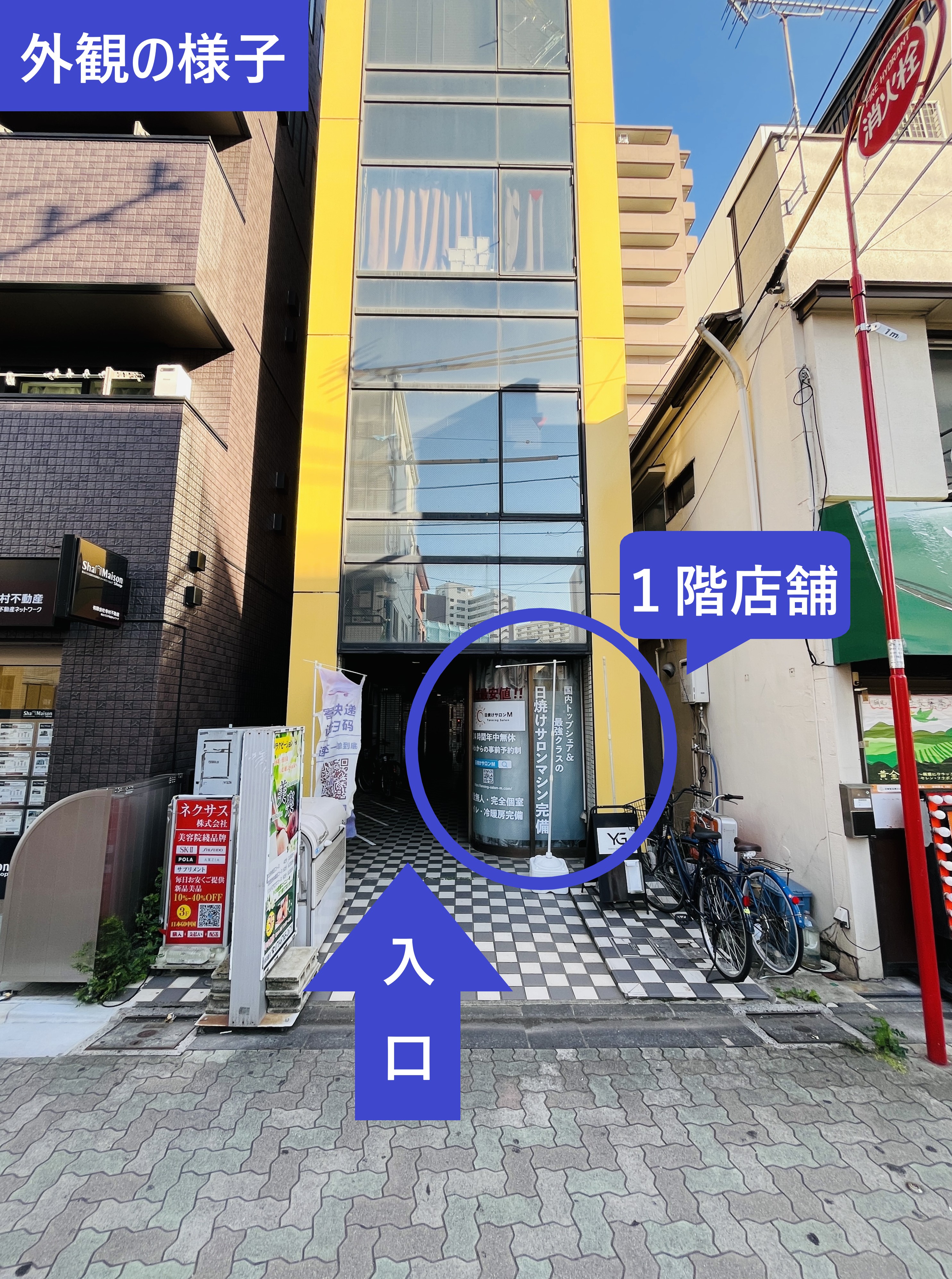 黄色く縁取られたガラス張りの建物が目印です。この建物の1階が当店になります。